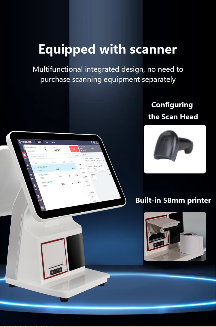 طابعة ماسح ضوئي 15 بوصة كل شيء في نظام نقطة البيع واحدة محطة تجارة التجزئة المطعم 15.6 بوصة POS برنامج الكمبيوتر آلة تسجيل النقد