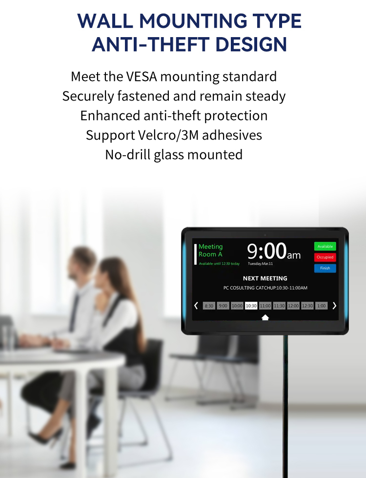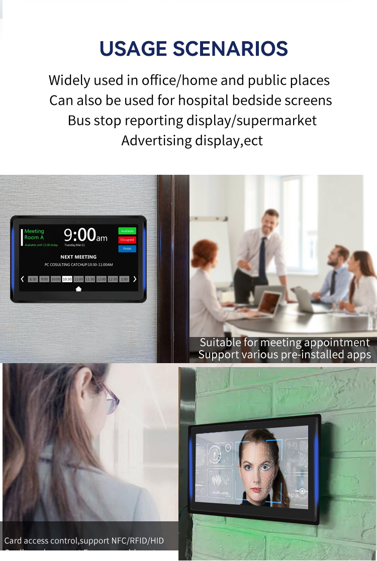 هذا الجهاز اللوحي ليس مثاليًا لحجز غرف المؤتمرات فحسب، بل يعمل أيضًا بشكل ممتاز كجهاز عرض لافتات رقمية أو محطة تحكم في الوصول الذكي أو كشك تفاعلي في مباني الشركات والفنادق والمستشفيات والمؤسسات التعليمية. بالنسبة للمكاملين والموزعين، فإنه يوفر حلاً متعدد الاستخدامات يلبي متطلبات مشاريع متعددة باستخدام نظام أساسي واحد للأجهزة.