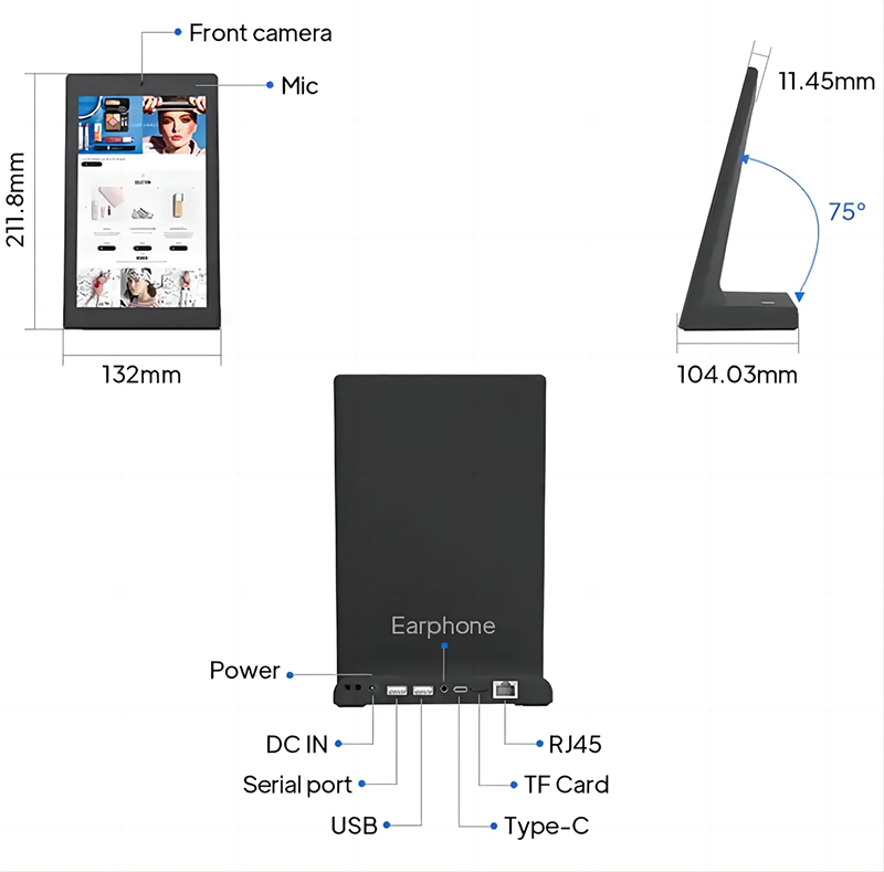 تم تصميم هذا الجهاز اللوحي على أندرويد على شكل كيوسك ليتلاءم بشكل مثالي في مكتب الاستقبال، ومكاتب الفندق، ومكاتب الدخول، ومحطات الخدمة، ومواقع اتصال العملاء حيث المساحة محدودة ولكن التفاعل متكرر.الهيكل على شكل حرف L يوفر وجودا مستقرا وأنيقا يسمح للضيوف بالاقتراب بشكل طبيعي من الشاشة وإكمال ردود الفعل أو خطوات الخدمة دون مشاركة الموظفينبالنسبة للمتكاملين والموزعين هذا الجهاز يوفر أساسا أجهزة موثوق بها لأنظمة خدمة العملاء إدارة الطابور منصات تقييم الضيوف وتطبيقات خدمة ذاتية خفيفة الوزن.